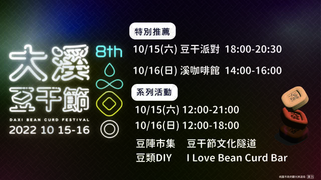 - 大溪豆干節4月-5月大溪傳統習俗中,每年大溪豆干業者會在特定期間聚在一起,製作一份超大豆干或豆類製品,祈求豆干業興盛承傳萬世,之後在分食讓眾人一起食,以保平安,這就是豆干節的由來