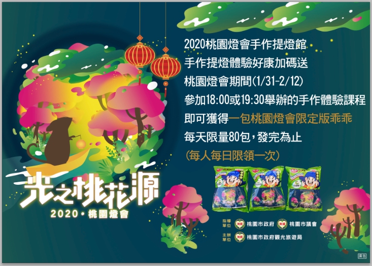 過年時節人人都用紅包袋來傳遞祝福與喜悅,這個過年期間的重點小物,沒想到也有機會變身成為精巧的手作提燈!這次在2020桃園燈會手作提燈館,將有機會利用紅包袋製作出極具個人特色的精巧燈籠。將紅包袋透過裁剪、拼貼與組裝,製作出來的燈籠不僅符合年節氛圍,也兼具環保的美意。覺得收到的紅包樣式都了無新意嗎?來參與課程,就可以作出專屬酷炫的紅包樣式,送禮自用都是吸睛的焦點!