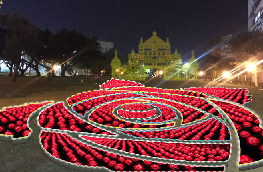 超過萬朵七彩變色玫瑰花組成耀眼奪目的玫瑰圖形花毯,是燈區中最引人注目的焦點!白天是一大片白色玫瑰花海,夜晚則將隨著出身桃園大溪,永遠的帽子歌后--鳳飛飛傳世的愛情歌曲「玫瑰玫瑰我愛你、好好愛我、愛你在我心口難開」,譜出「音樂花海燈光秀」的展演篇章;隨著音樂的旋律欣賞七彩花朵變幻,還能走入花叢中,留下最美麗的倩影。