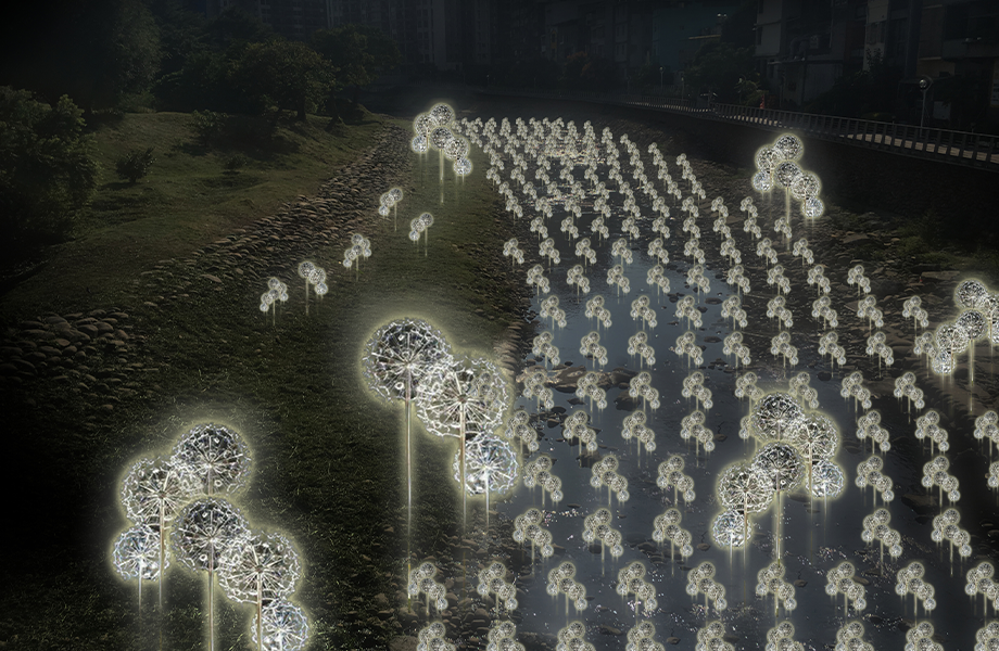 「飛絮重生」以大量雪白的「蒲公英花朵燈」佈置在老街溪新勢公園段水域兩側溪畔,形成帶狀的雪白蒲公英花海,營造雪白飛絮地景。這就像「蒲公英春暖花開,雪白飛絮遠颺,孕育新生」一般,在老街溪重現生機之後,透過種子飛絮孕育新生。